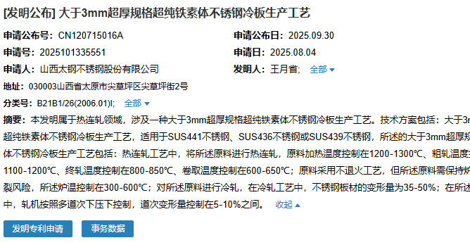 2025年9月30日,山西太鋼不銹鋼股份有限公司成功申請(qǐng)一項(xiàng)名為“大于3mm超厚規(guī)格超純鐵素體不銹鋼冷板生產(chǎn)工藝”專利,申請(qǐng)公布號(hào)為CN120715016A,申請(qǐng)日期為2025年8月4日。