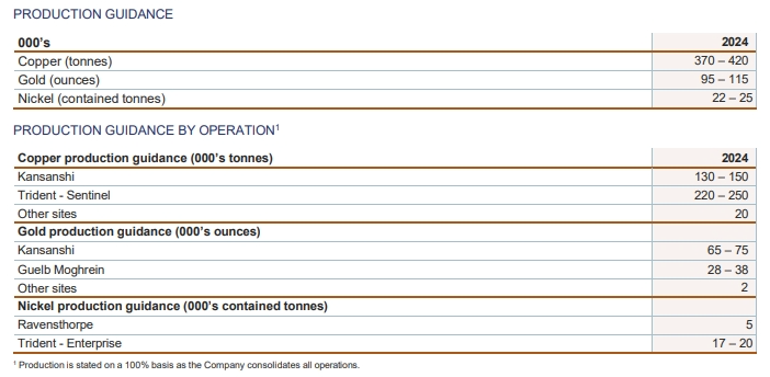 公司維持全年銅產量370,000至420,000噸、黃金產量95,000至115,000盎司的生產指導,鎳產量指導則調整為22,000至25,000噸。