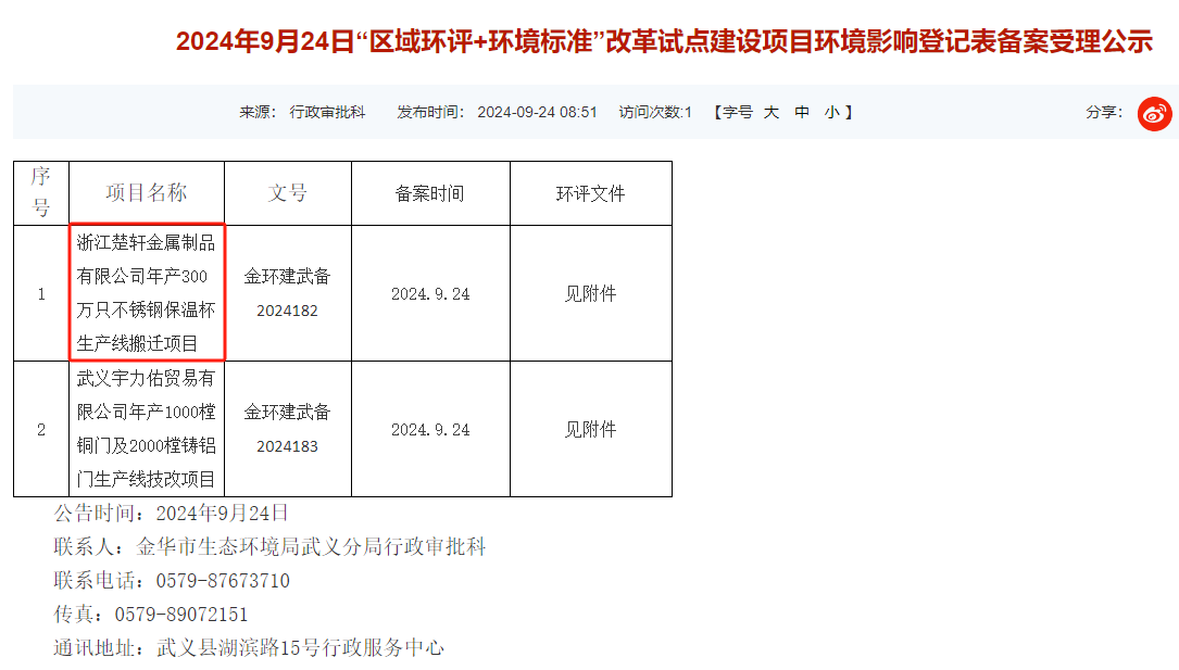 9月24日,金華市生態環境局武義分局就浙江楚軒金屬制品有限公司年產300萬只不銹鋼保溫杯生產線搬遷項目環境影響評價報告表進行登記備案受理公示。