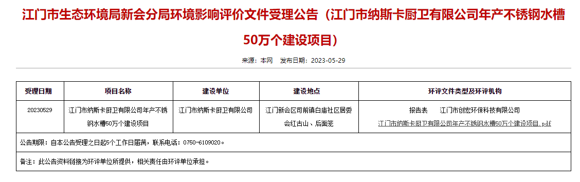5月29日,江門市生態(tài)環(huán)境局新會分局受理江門市納斯卡廚衛(wèi)有限公司年產(chǎn)不銹鋼水槽50萬個建設(shè)項目環(huán)境影響評價文件并對外進行公告,公告期:5個工作日。