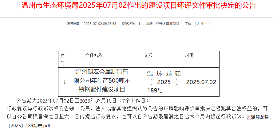 2025年7月2日,溫州市生態(tài)環(huán)境局龍灣分局就溫州朗宏金屬制品有限公司年生產(chǎn)500噸不銹鋼配件建設項目環(huán)評文件作出審批決定并對外進行公告,公告期為2025年07月02日至2025年07月10日(7個工作日)。