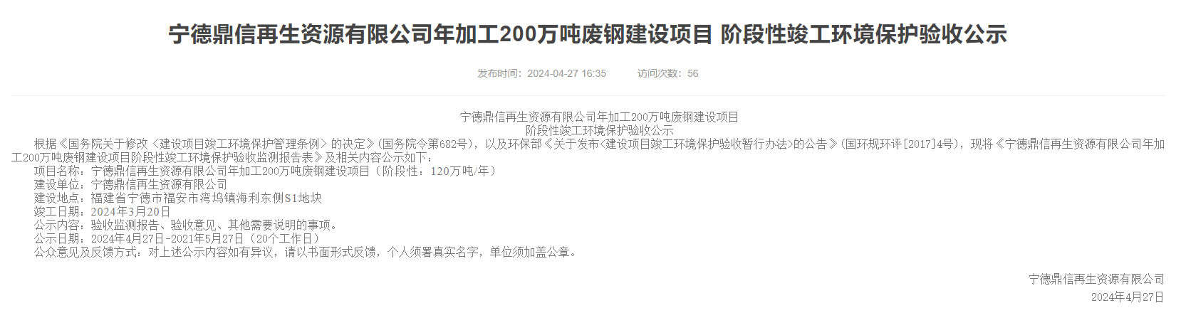4月27日,寧德鼎信再生資源有限公司年加工200萬噸廢鋼建設項目階段性(120萬噸/年)竣工環(huán)境保護驗收公示,公示日期:2024年4月27日-2021年5月27日(20個工作日)。