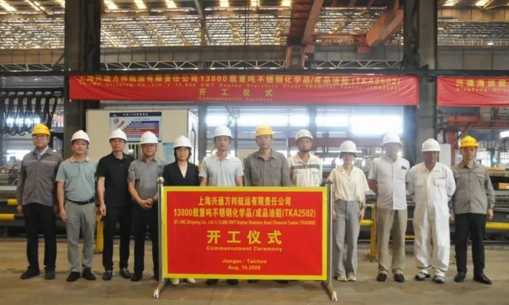 8月15日,上海興通萬邦航運有限責任公司與控股股東興通海運股份有限公司在泰州口岸船舶有限公司共同舉行2艘13000噸級不銹鋼化學品船開工儀式。兩艘船舶同步啟動建造,充分體現了項目推進的高效節奏與雙方團隊的緊密協同能力。據悉,該批次剩余2艘船舶也將按計劃有序開工。興通股份副總裁陳其德、興通萬邦副總經理黃愛蘭分別率團隊出席儀式。